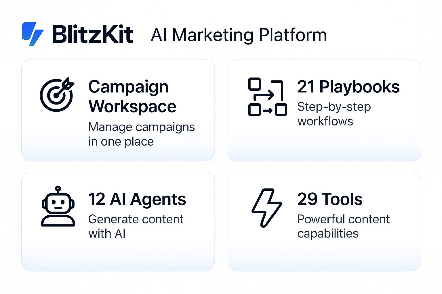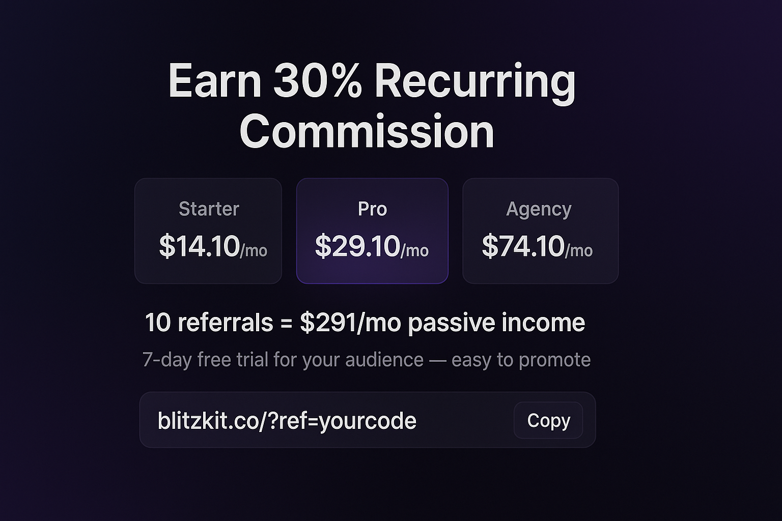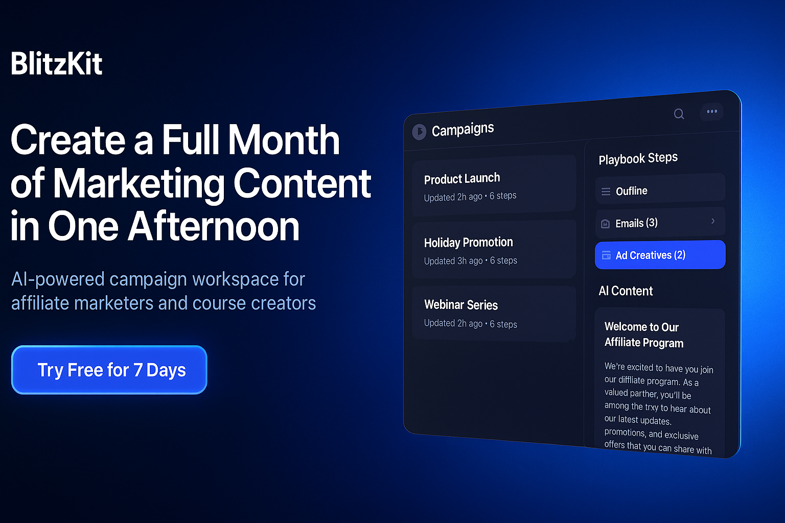 Create a campaign inside BlitzKit with "BlitzKit" as your product. Paste your affiliate link. Let it write your emails, hooks, social posts, and landing page β automatically. Then promote those to your audience and earn commission on every signup.